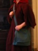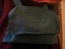 Trapezförmiger Beutel aus ungefärbten Leinen mit einem Trageriemen aus dem gleichen Stoff. Ohne Verschluss. Breite ca. 50 cm, Höhe ca. 40cm